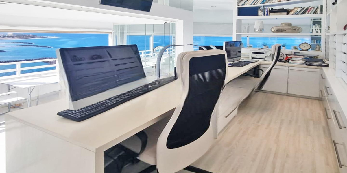With a total area of 192 m², the penthouse is thoughtfully divided into a spacious living-dining room, an exceptional fully equipped open-plan kitchen that combines modern design with functionality, perfect for cooking while enjoying the views. The overall style of the property is very minimalist, with a clean, modern aesthetic complemented by large mirrors that visually expand the space and reflect the stunning views. Everything is arranged in an open design, creating a sense of space and elegance.